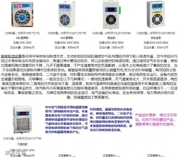 CS800、CS810、CS820、CS880系列的除濕器用于開(kāi)關(guān)柜、配電柜、控制柜的除濕之用。這是一種排水弄除濕器,功率有大有小和相應(yīng)的排水量。