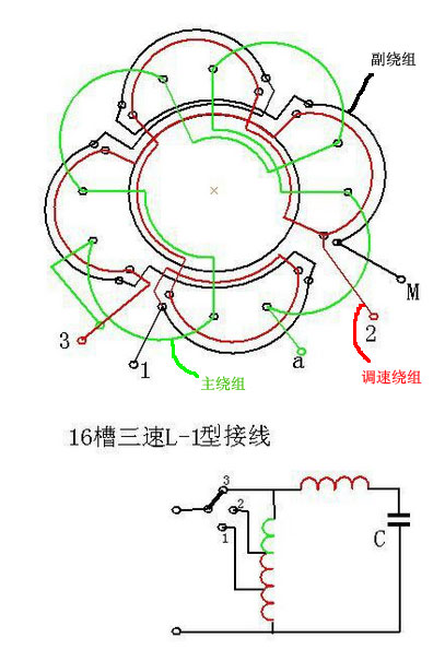 圖中1,2,3分別表示高中低三個(gè)速度,a是公共端,M是電容端,電容接到a和M之間。 此繞組結(jié)構(gòu)相對(duì)簡(jiǎn)單,線圈數(shù)量較其他形式的繞組要少,且調(diào)速性能較好。是三速電機(jī)應(yīng)用Z多的一種繞組形式。