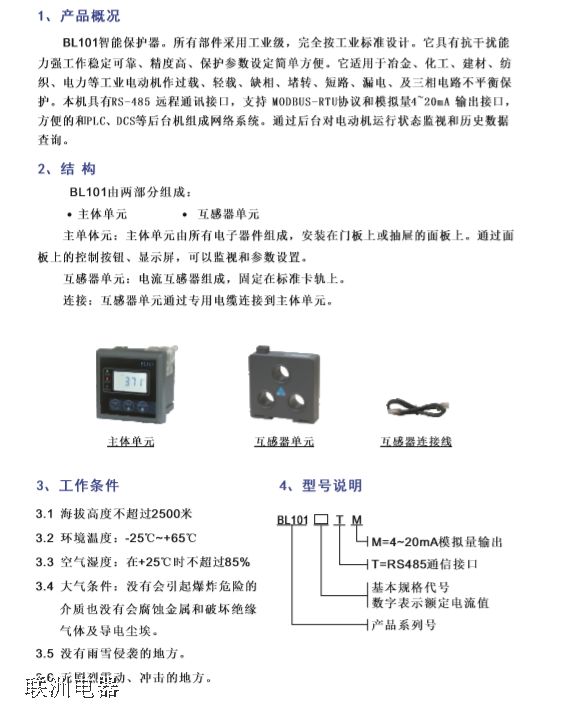 BL101智能保護器。所有部件采用工業(yè)級,完全按工業(yè)標準設計。它具有抗干擾能 力強工作穩(wěn)定可靠、精度高、保護參數(shù)設定簡單方便。它適用于冶金、化工、建材、紡 織、電力等工業(yè)電動機作過載、輕載、缺相、堵轉(zhuǎn)、短路、漏電、及三相電路不平衡保 護。本機具有RS-485 遠程通訊接口,支持 MODBUS-RTU協(xié)議和模擬量4~20mA 輸出接口,