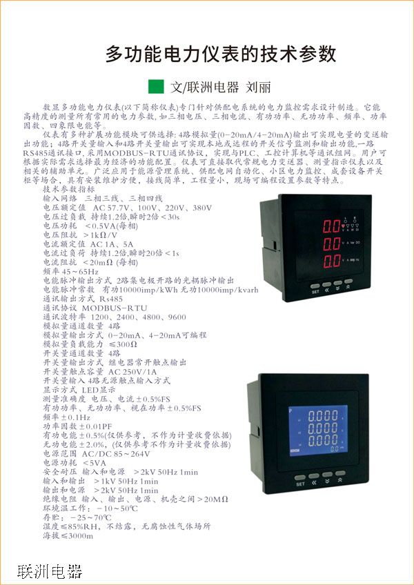 測量:三相電壓、電流、有功功率、無功功率、功率因數(shù)、率、有功電能、無功電能尖、峰、平、谷四種裁率計(jì)量具備測測量2-31次諧波分析采用高可靠性工業(yè)級DSP,數(shù)據(jù)采集速度快,測量精度高,運(yùn)算處理速度強(qiáng)大的數(shù)據(jù)采和處理功能,可實(shí)現(xiàn)一個(gè)回路全電氣的測量・體積小,安裝方便,采用自鎖面板式安裝機(jī)構(gòu),無需螺絲固定即可安裝,・接線方便靈活,三相三線制、三相四線制可通過面板編程設(shè)置可選配1路RS485通訊口( Modbus通信協(xié)議),與其他設(shè)備進(jìn)行聯(lián)網(wǎng)通信可選配1~4路4~20mA的模擬量輸出和1~4路開關(guān)量輸入輸出