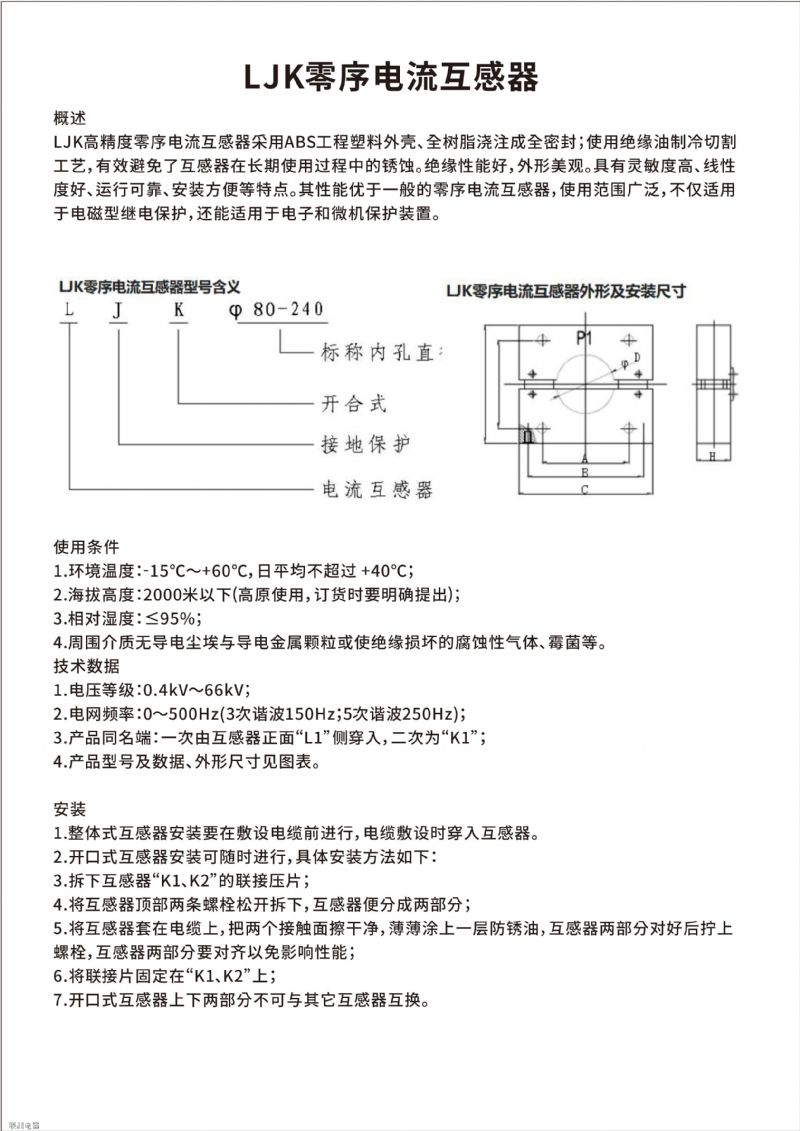 LJK高精度零序電流互感器采用ABS工程塑料外殼、全樹脂澆注成全密封;使用絕緣油制冷切割工藝,有效避免了互感器在長期使用過程中的銹蝕。絕緣性能好,外形美觀。其性能優(yōu)于一般的零序電流互感器,使用范圍廣泛,不僅適用于電磁型繼電保護(hù),還能適用于電子和微機(jī)保護(hù)裝置。