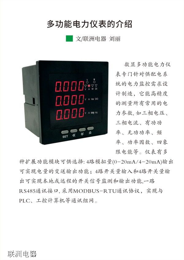 醴陵聯(lián)洲電器有限公司是一家專(zhuān)業(yè)致力于BM652,BM652-DX,BM552,BM452的企業(yè),擁有先進(jìn)的技術(shù)、優(yōu)質(zhì)的服務(wù)!我公司主要產(chǎn)品:智能數(shù)顯表,多功能數(shù)顯表,多功能網(wǎng)絡(luò)儀表,多功能電力儀表。我們面向全國(guó),提供BM652,BM652-DX多功能電力儀表服務(wù)。