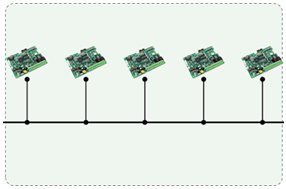 信息在一條公共通道上傳輸,信息接收者從通道上接收所有信息,并根據規(guī)則過濾發(fā)送給自己的信息。連線少,結構清晰,僅需≤n+1根線。