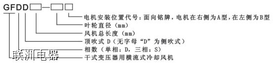 例:風機型號為GFDD470-120A,表示工作電壓單相220V、風機總長為470mm,葉輪直徑為120mm,電機安裝在右側(cè)的頂吹式干式變壓器用橫流式冷卻風機。